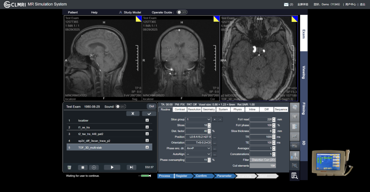 本课程基于多病例MRI数字人技术,采用“虚拟扫描,真实重建”的虚实融合创新仿真实验模式,融合了医学影像成像原理、医学影像诊断学和医学影像检查技术学等多门课程知识,旨在培养学生MRI动手操作能力、影像诊断综合思维能力和研究探索精神。本课程虚拟仿真教学平台CLMRI已经覆盖了头颈部、四肢关节、脊柱、胸部和腹部的平扫以及增强等40多个检查部位,着力打造“沉浸式学习-自主化训练-精准化评价”一体化教学体系,近4年共7轮应用后,生均操作时间显著提升,学生MRI操作能力获行业认可,并服务全国80多所高校及医疗机构超47万人次。本课程曾获2021年上海市一流本科课程,入选2025年教育部教育技术与资源发展中心(中央电化教育馆)发布的“高等学校虚拟仿真教学创新实验室项目第二批项目学校及案例团队名单”。