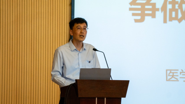 党总支副书记、院长李晓欧在致辞中勉励大家要“拥抱青春梦想、争做医影先锋”,他从教育理念、师资队伍、教学条件、教学创新等方面介绍了“我们的家”;从七十多年办学历程积累的文化底蕴回顾了“我们的传统”;从不同年级的阶段性培养目标、国际交流合作、技能竞赛和创新创业大赛等介绍了“我们的学习”;从国家战略、行业需求的角度强调了影像人的责任与担当,并强调了牢记习近平总书记“心有所信、方能行远”嘱托,学思践悟、奋发有为,做有根有魂新青年的“我们的目标”。