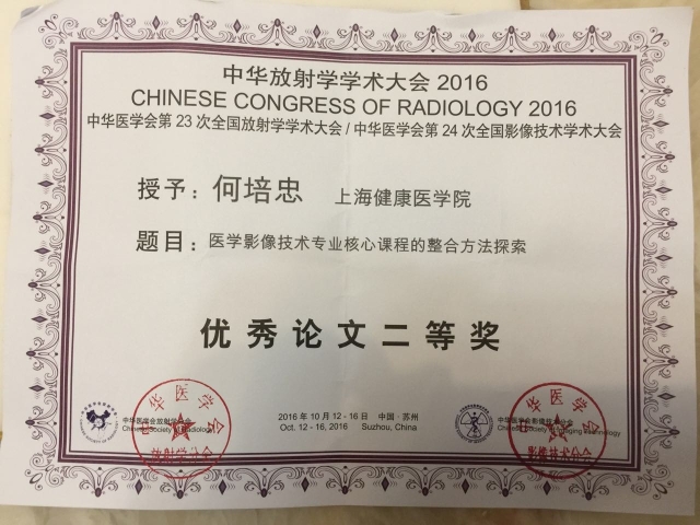 上海健康医学院校长黄钢教授应邀出席了大会,并作了题为《肿瘤的葡萄糖代谢变化及耐药机制》主旨演讲,受到与会专家的高度评价。医学影像学院院长何培忠教授、周进祝教授等12老师参加了这次盛会,其中有5位教师在医学影像教育学组会议上进行了论文交流演讲。何院长的《医学影像技术专业核心课程的整合方法探索》获优秀论文二等奖。