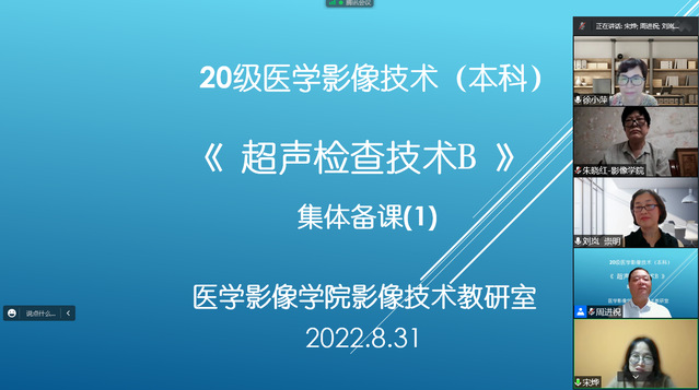 正值我校迎接本科教学工作合格评估之际,为进一步提升专业课程教学质量和本科人才培养水平,突显院校“三全育人”的教学特色,8月31日晚,医学影像学院超声检查技术课程团队开展本学期首次集体备课会,会议由周进祝教授主持,课程团队全员参加并邀请徐小萍院长和医学影像技术教研室彭文献主任参会指导。