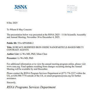近日,国际放射学领域最高级别的学术盛会——2025年第111届北美放射学会年会(RSNA)在美国芝加哥隆重举行。本届大会以“Imaging the Individual: Precision Health through Diversity, Equity and Inclusion(聚焦个体影像:通过多元化、公平性和包容性实现精准健康)“为主题,汇聚全球智慧,共议精准健康未来,吸引了来自全球超过130个国家的5万余名学者、专家及行业代表参与,共同呈现了学科前沿动态。医学影像学院吴励副教授赴本届盛会,并作为通讯作者及团队代表,领取了“Trainee Research Prize”获奖证书,并向全球同行展示了题为《Surface-modified Iron Oxide Nanoparticles-based MRI T1 Contrast Agents》的创新研究成果。