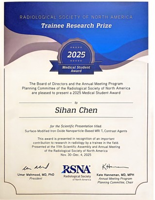 北美放射学会(RSNA)设立的“Trainee Research Prize”(学员研究奖)旨在嘉奖全球青年研究员的杰出原创工作,设有专科培训、住院医师、医学生3类评奖项目,评选标准极为严苛。今年,全球医学生仅有15人获此殊荣,竞争异常激烈。吴励团队的成果从分子影像领域超12,000份投稿中脱颖而出,成为医学生类别奖项该领域2个获奖项目之一,这充分彰显了其研究的国际前沿性与创新价值。
